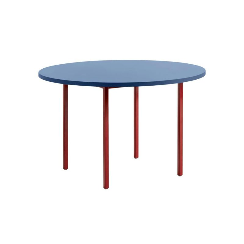 Tofarget spisebord. Two-Colour-serien kombinerer sterke stålrør med FSC-sertifisert Valchromat®-bordplate i organiske farger. Den samme tykkelsen skaper et harmonisk uttrykk med kontrasterende fargekombinasjoner. Finnes i flere former, størrelser og farger, perfekt for alt fra hjem og kontor til kafé og restaurant.