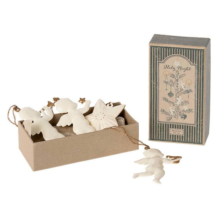 Denne gaveæske med 4 skønne Maileg ornamenter er perfekt til enhver anledning. Den indeholder 3 forskellige engle og en stjerne, alle indpakket i silkepapir og leveret i en gaveæske udsmykket med Dorthe Mailils tegninger.