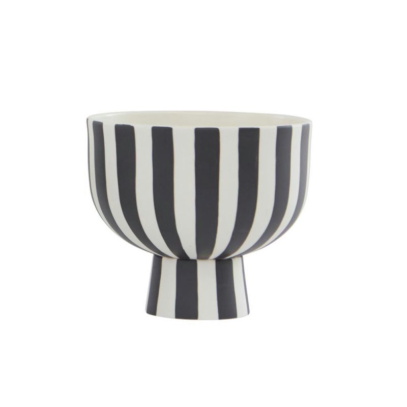 Toppu skål kjennetegnes av et grafisk og stilrent design som tilfører interiøret et dekorativt og moderne uttrykk. Skålen kan brukes som potteskjuler, men er også godkjent for mat og egner seg derfor perfekt til servering av frukt og lignende. Skålen er håndlaget i 100% steintøy, noe som gir hvert produkt et unikt preg.
