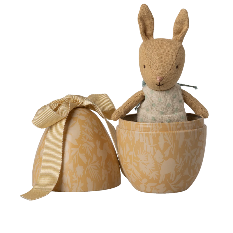 Inne i dette metall-egget, trykket med et vakkert mønster og en stor, myk sløyfe på toppen, finner du en myk kanin som har på seg et fint antrekk. En perfekt gave til de små. Kaninen har magneter i hendene, slik at den kan holde rundt egget. Egget er ikke leketøy.