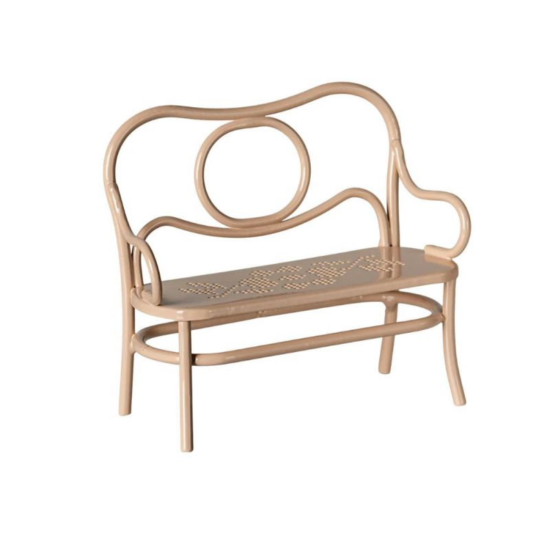 Café møbler der passer til mus i mor og far størrelse. Sættet består af en bænk og et bord og er det perfekte sted at nyde en kop eftermiddagste.
