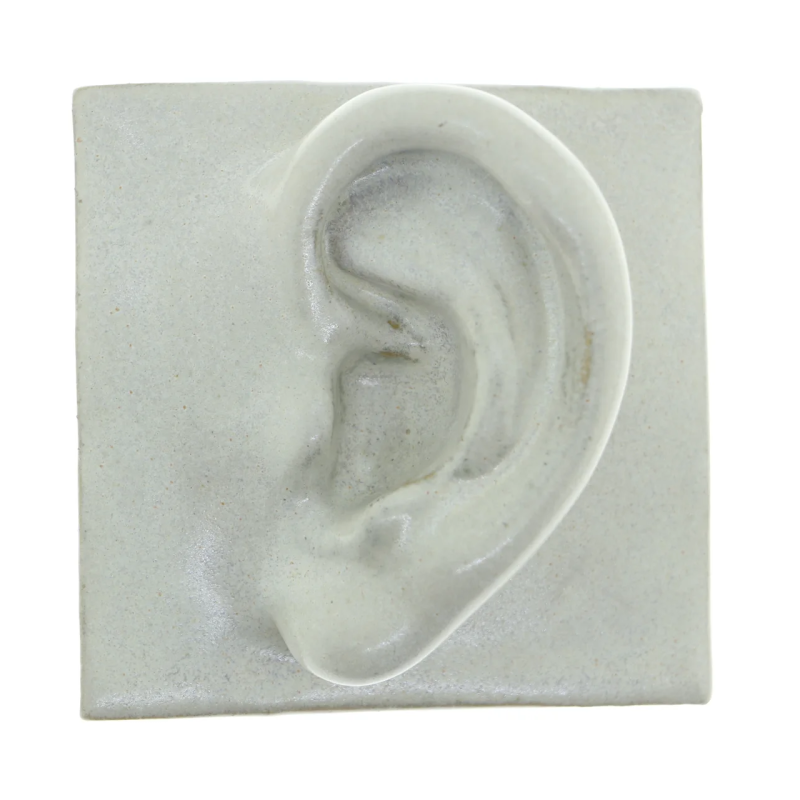 Venstre øre antikk hvit. Venstre øre fra relieffserien, håndlaget i Aarhus og inspirert av gammel skulptur. Beregnet for vegghenging alene eller i kombinasjon med andre relieffer. Left Ear kan henges i fire retninger og inviterer deg til å leke med komposisjon og personlig uttrykk.