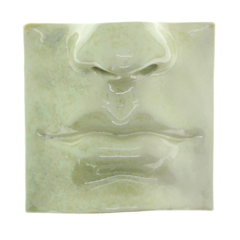 Munn 1 Krystallgrønn. Lindring av en munn fra serien. Håndlaget i Aarhus basert på gammel skulptur. Beregnet for vegghenging alene eller i kombinasjon med andre relieffer. Kan henges på fire måter og innbyr til leken og personlig opphenging.