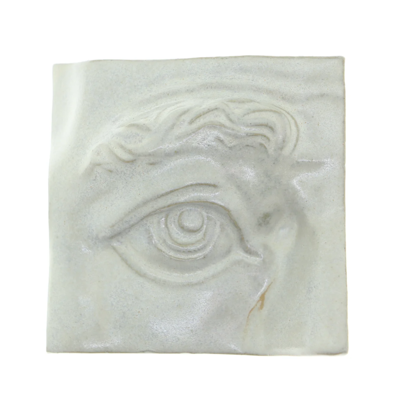 Høyre øye antikk hvit. Relieff av et høyre øye, håndlaget i Aarhus med inspirasjon fra gammel skulptur. Beregnet for vegghenging alene eller sammen med andre relieffer. Kan monteres på fire måter og innbyr til personlig og kreativ opphenging.