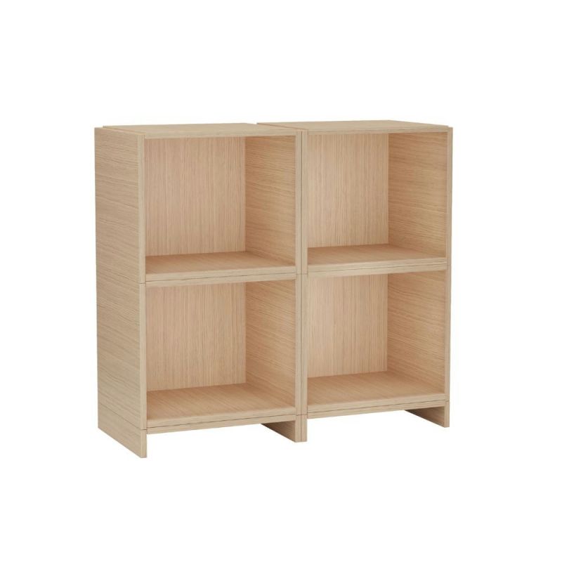 Dette er Bricks system E. Bricks er laget av fem FSC®-sertifiserte eikesider som er satt sammen på forskjellige nivåer, slik at elementene kan stables oppå hverandre i en selvlåsende konstruksjon. Det klassiske modulære oppbevaringssystemet består av individuelle kuber som enten kan monteres på veggen eller plasseres på en sokkel. Lag en romdeler, veggmontert bokhylle eller snu kuben opp ned som et sidebord.