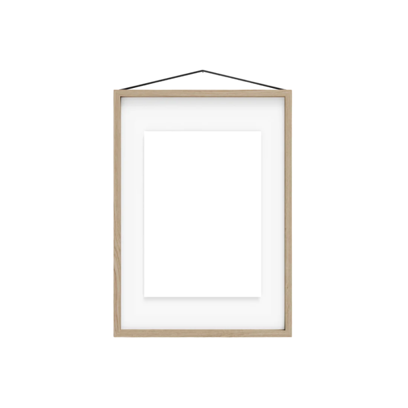 MOEBE Frame enkel og fleksibel bilderamme i bjørketre med transparent akrylglass og strikk. De to nye fargene fremhever treets naturlige årer, og strikken matcher fargen. Rammen kan henges vertikalt eller horisontalt og kan sees fra begge sider, perfekt for bilder og kunst i alle størrelser.
