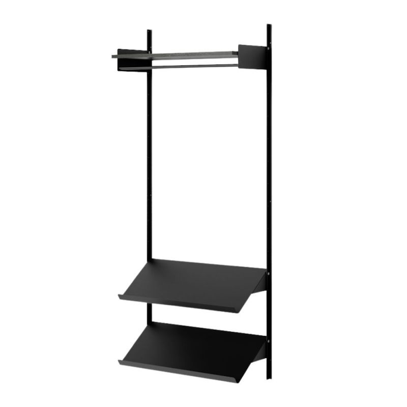 Med nye elementer for oppbevaring av klær kommer New Works reolsystem inn i gangen og garderoben og tilfører et raffinert uttrykk til et ellers praktisk møbel. New Works Wardrobe Shelf 1 leveres med en kombinert hattehylle og kleshengerstang samt to skohyller for optimal oppbevaring.