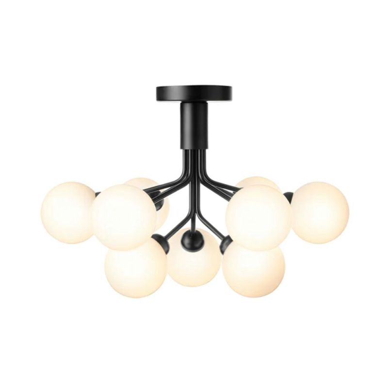 Loftslampen Apiales 9 er en smuk og enestående lysekrone, designet af Sofie Refer som har fundet sin inspiration i blomster og deres skæhed. Lysekronen Apiales 9 er fremstillet af pulverlakeret eller anodiseret metal, som fås i sort eller messing farve. Hver lampe har 9 mundblæste skærme som giver et behageligt og blødt lys, velegnet til brug hen over spisebordet i spisestuen eller det større køkken.