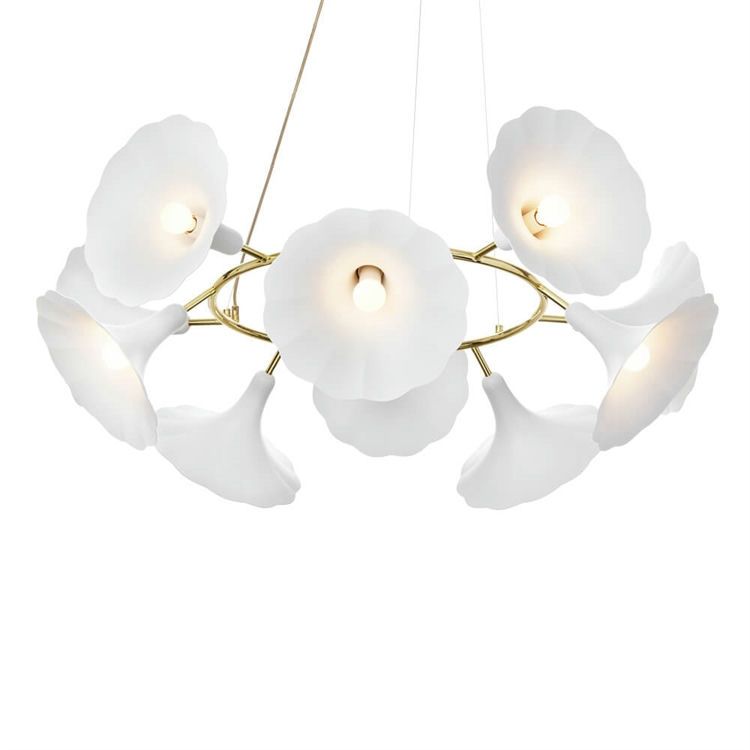 10 blomsterformede nyanser av hvitt metall flyter elegant fra en polert messingring, og skaper et romantisk uttrykk.