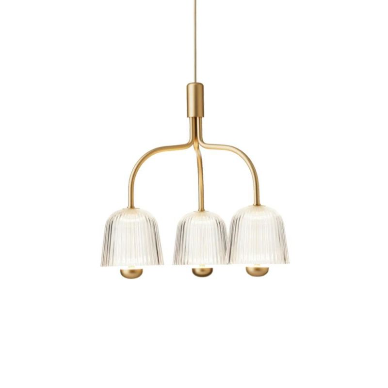 Asteea 3 lysekrone. Asteea 3 er en moderne tolkning av den klassiske krystalllysekronen, elegant og funksjonell på samme tid. Tre buede metallarmer i satengmessing har rillede, klare akrylskjermer med integrert LED som avgir et mykt, blendfritt lys. Perfekt som dekorativ belysning over spisebordet alene eller i kombinasjon for et mer slående uttrykk.