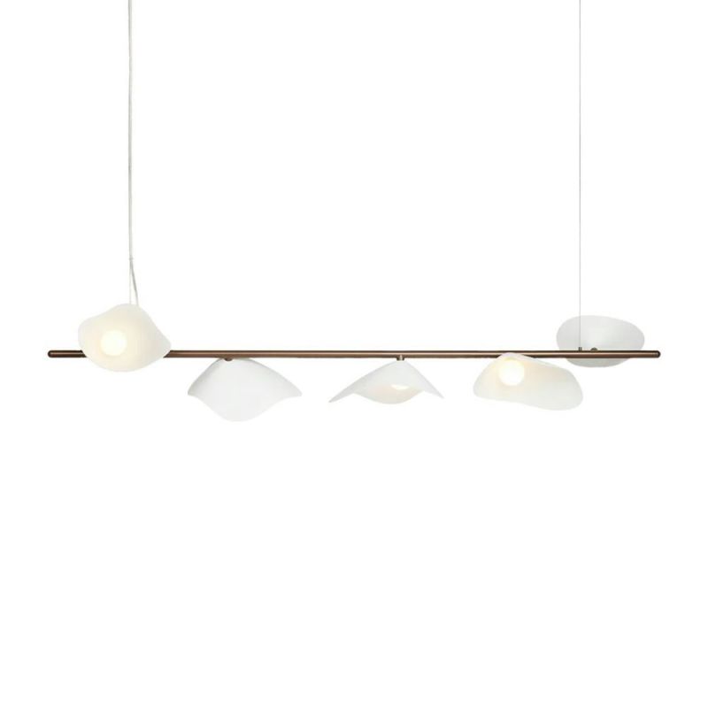 Florii 5 Lineær. Florii 5 Linear er en moderne tolkning av lysekronen som er ideell over spisebordet eller kjøkkenøya. De myke, hvite metallskjermene balanseres av en slank, lineær metallstang, noe som skaper et harmonisk og organisk uttrykk. Integrert LED sikrer langvarig, varm belysning og kan enkelt byttes ut uten verktøy.