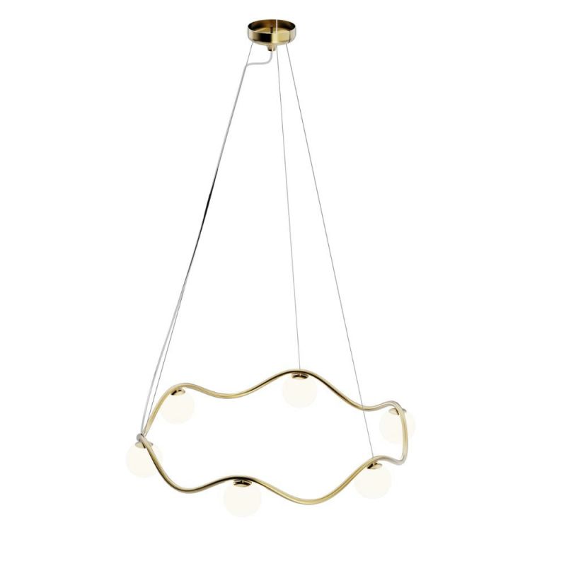Wave pendellampe Sculptural Elegance i messing. Wave er en moderne lysekrone med et skulpturelt uttrykk, designet for moderne rom med sans for estetikk. Den bølgende formen i massiv messing henger elegant fra tynne tråder, og skaper en lett og svevende følelse i rommet. Den organiske silhuetten tilfører både bevegelse og ro, og gjør lampen til et iøynefallende midtpunkt over spisebordet, i gangen eller som en del av en større rominstallasjon.