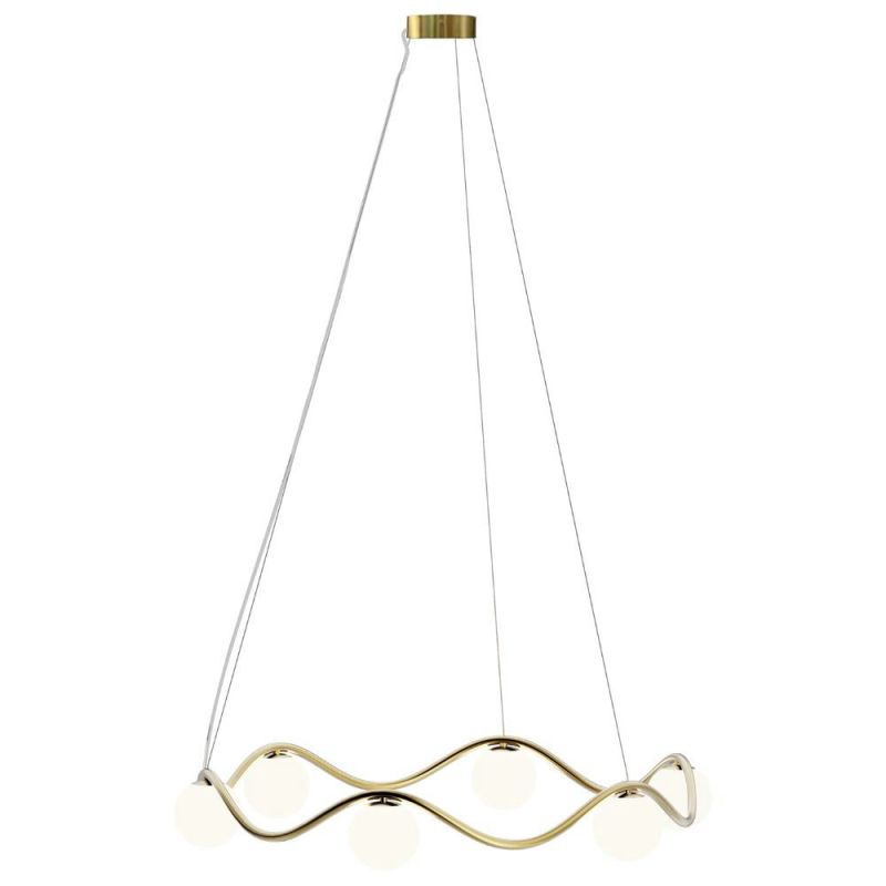 Wave pendellampe Sculptural Elegance i messing. Wave er en moderne lysekrone med et skulpturelt uttrykk, designet for moderne rom med sans for estetikk. Den bølgende formen i massiv messing henger elegant fra tynne tråder, og skaper en lett og svevende følelse i rommet. Den organiske silhuetten tilfører både bevegelse og ro, og gjør lampen til et iøynefallende midtpunkt over spisebordet, i gangen eller som en del av en større rominstallasjon.