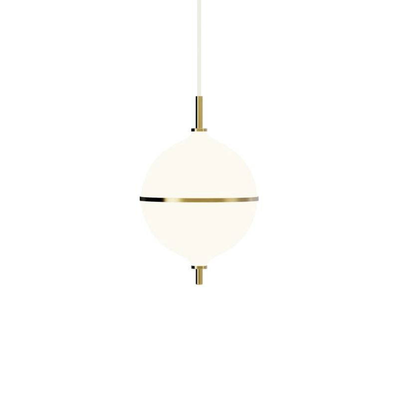 Tidløs eleganse minimalistisk globeanheng. Et anheng med et enkelt og sofistikert uttrykk. Den frostede opalglasskuppelen er elegant balansert og delt av en fin metallisk detalj, noe som skaper en harmonisk kontrast mellom det myke lyset og den varme messingfinishen. Et stilig valg for moderne og klassiske rom.