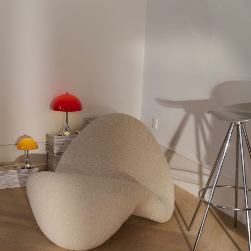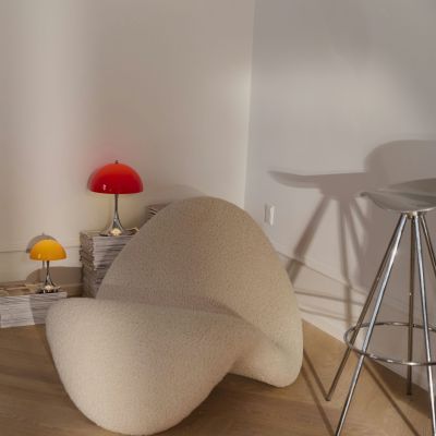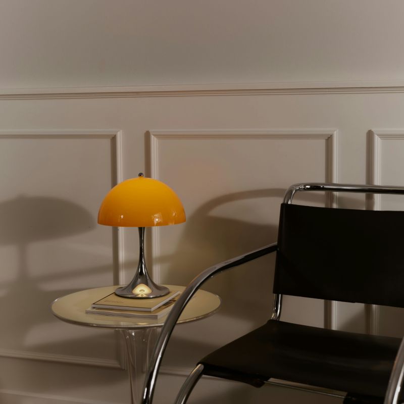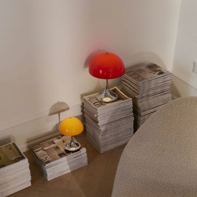 Panthella reflekterer Verner Pantons store personlighet og regnes som et av hans mest betydningsfulle design. Han ønsket å skape en blendefri lampe som samtidig reflekterte lyset gjennom sine organiske former. Dette målet oppnådde han i 1971 i samarbeid med Louis Poulsen. Den ikoniske formen sikrer en myk lysrefleksjon via skjermen og den trompetformede foten, noe som har gjort Panthella til et designikon. Panthella 250 Portable er en kompakt utgave med en diameter på 250 mm, ideell for fleksibel bruk både innendørs og utendørs, hvor den skaper en stemningsfull belysning. Dette er 100-års Jubileums utgaven.
