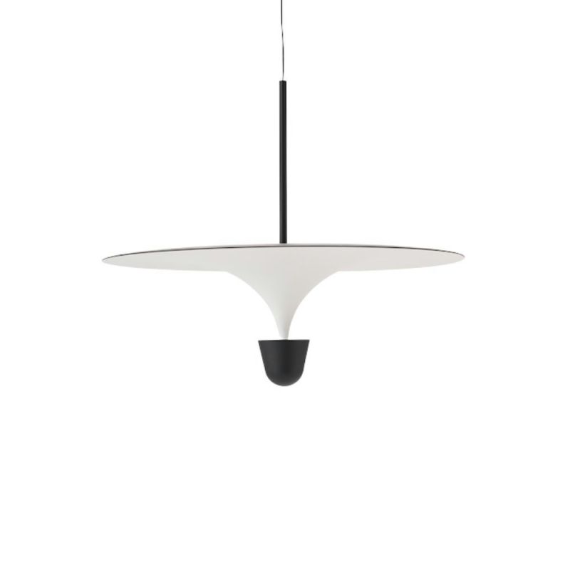 Kantarell pendellampen sprer sitt lys fra et kontrasterende midtpunkt og diffunderer det over en mykt buet skjerm. Dens elegante, grafiske silhuett, som er skapt mellom de to konsentriske sirklene lampeskjermen og reflektoren tiltrekker umiddelbart øyet og definerer et rom i rommet.