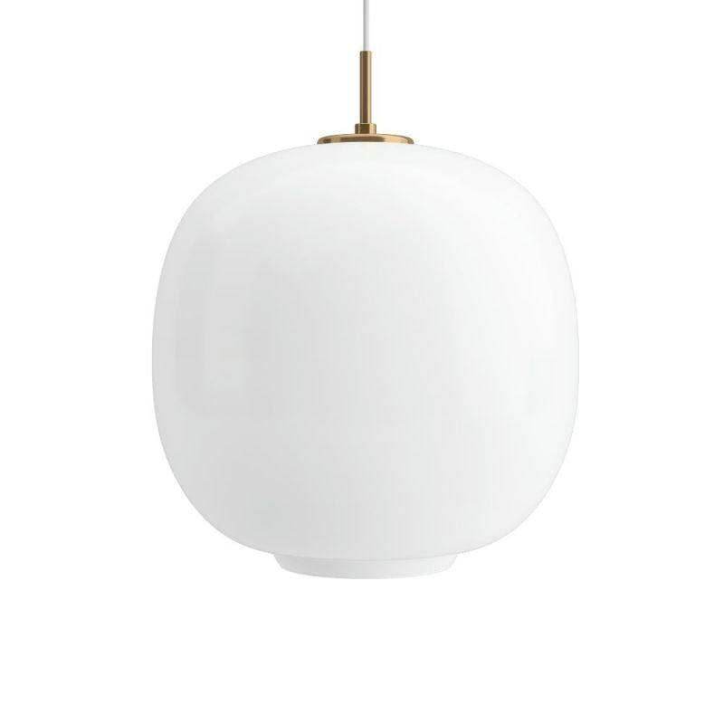 Louis Poulsen relanserte den unike og verdenskjente Radiohuset-pendelen i 2016. Pendelen ble opprinnelig designet av Vilhelm Lauritzen i 1945 for radiohuset i København. Anhenget er laget av håndblåst opalglass med oppheng av børstet messing. Messingen er ikke overflatebehandlet og vil endre seg over tid og få en unik patina.