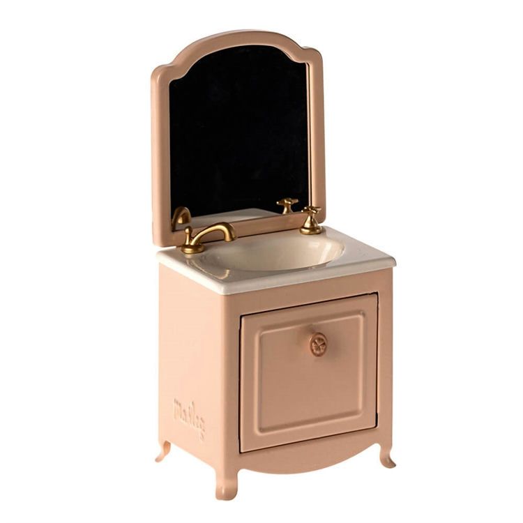 Et must-have til badet for musene. Kommoden har både et lite skap under vasken og et speil. For å fullføre badet, legg til Maileg toalett og badekar.