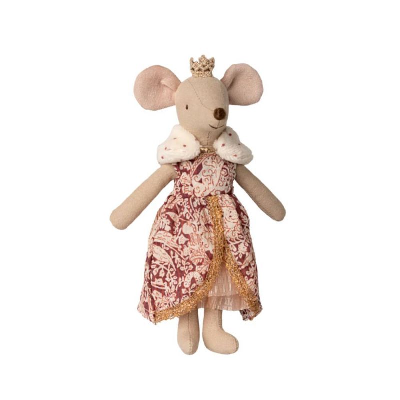 Dronningmusen i størrelse Mor er klar til å være vertinne på sitt slott. Hun har en vakker kongelig kjole og krone på seg og passer perfekt inn i slottsalen.