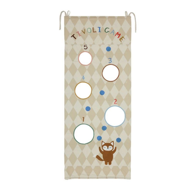 Tivoli Game Door bringer klassisk tivolilek inn i hjemmet med sitt lekne karnevalinspirerte design. Heng det i en døråpning med stoffstropper ideelt på en teleskopstang og bytt på å kaste baller gjennom de nummererte hullene for å samle poeng.