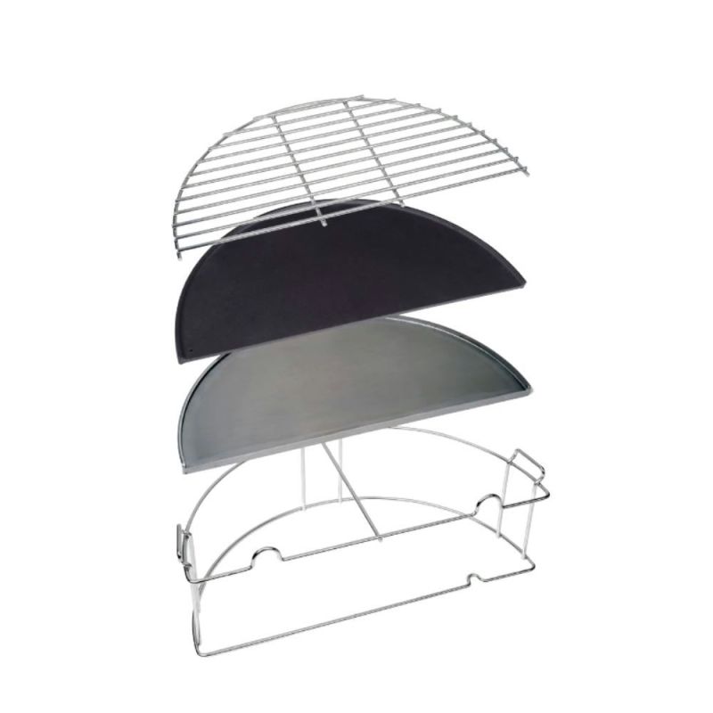 Forbedre grillopplevelsen din med Everdure 4K 'Half-Moon Riser' Kit. Designet for 46 cm/18 tommer grill, utvider det matlagingsområdet ditt til 537 kvadrattommer. Inkluderer en kromriser, støpejernsplate og grill- og flatplate i rustfritt stål for allsidig matlaging.