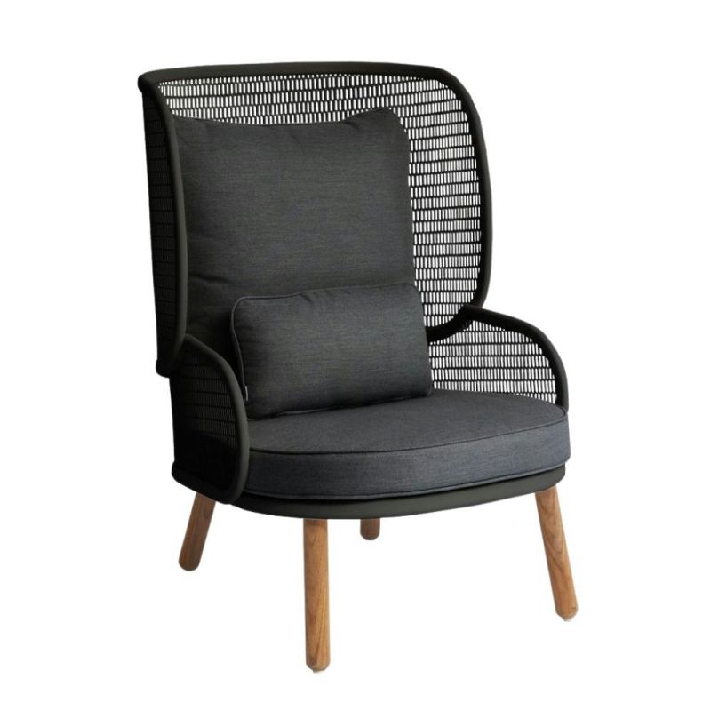 Mindo 118 Lounge Chair tilbyr komfort og en unik estetikk med sin høye rygg og luftige design. Den buede ryggen og de myke putene står i flott kontrast til de robuste teakbena, noe som skaper en skulpturell og innbydende sitteplass.