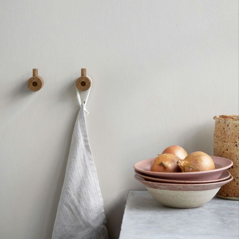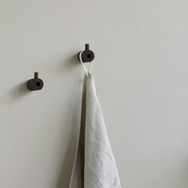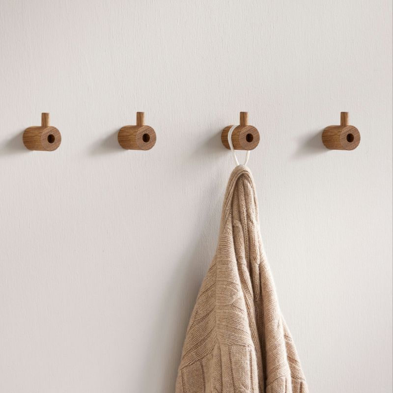 Wooden Wall Hook er laget av to stykker massivt eiketre. Den store delen monteres på veggen, og den mindre delen skyves ned ovenfra, slik at skruen skjules, og du får et perfekt opphengspunkt. Kroker fungerer både enkeltvis og i serie.