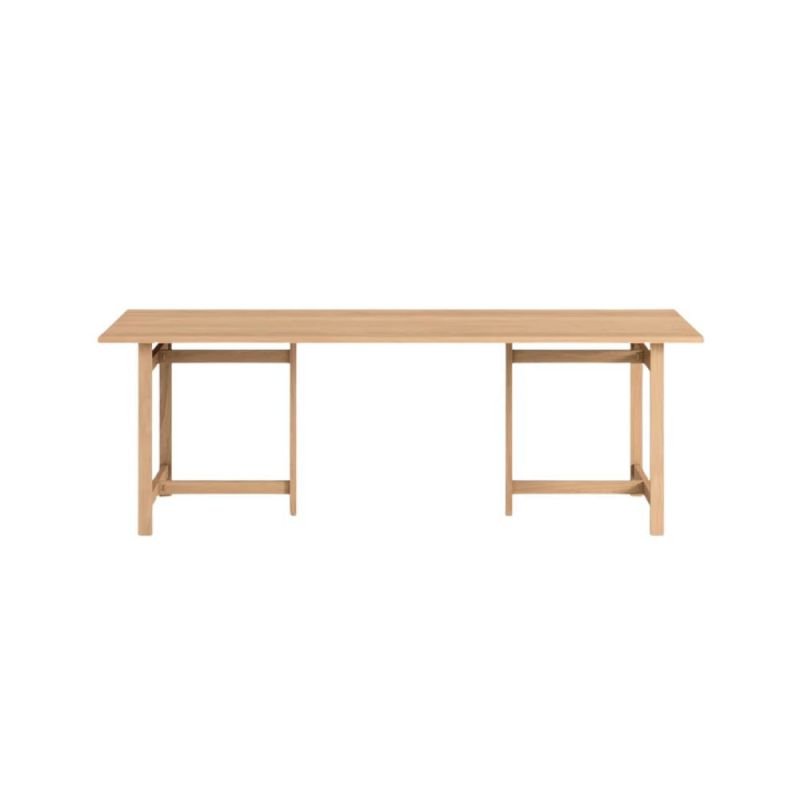 MOEBE Rectangular Dining Table er et enkelt og elegant spisebord med en solid T-ramme konstruksjon og fine messingdetaljer. Bordet er FSC-sertifisert, produsert i Europa og leveres flatpack for enkel montering. Tilgjengelig med linoleumsoverflate i rød, grønn eller mushroom samt i klassisk eik. Kjøp inntil to forlengelser én i hver ende for å utvide bordet med 20 eller 40 cm.