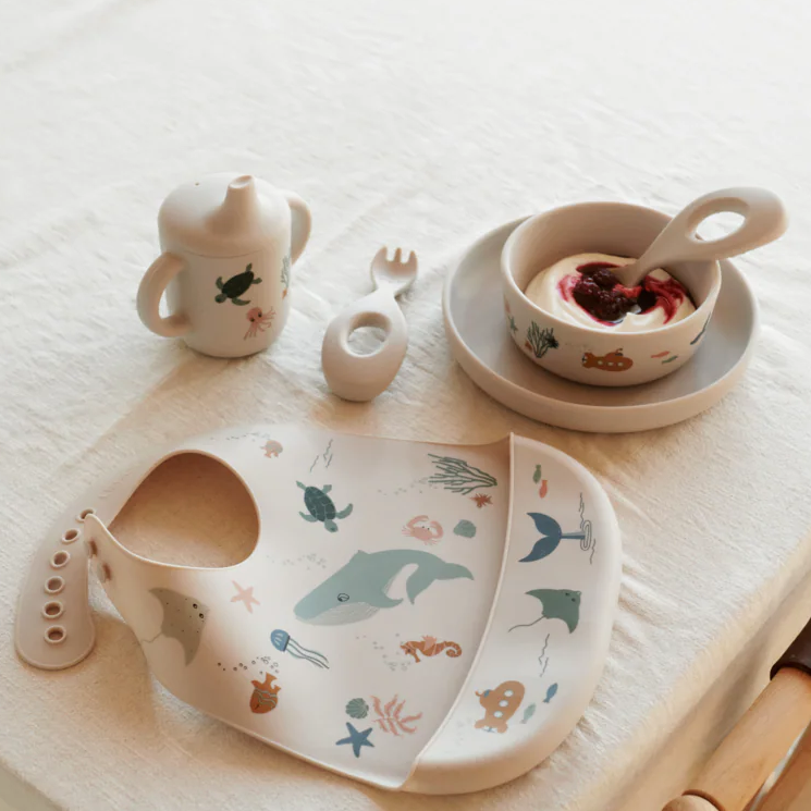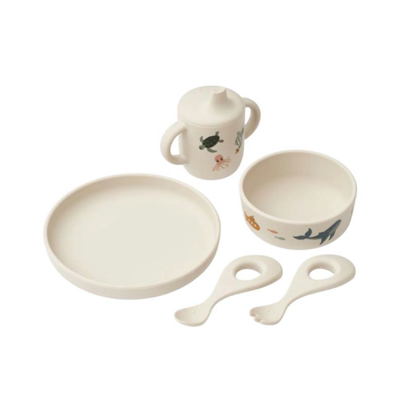 RYLE servisesettet inkluderer en gaffel og skje, bolle, tallerken og tutekopp og er altså en samling av alle måltidsfavoritter med finurlige print. Det populære settet er laget i slitesterk silikon og er både bruddsikkert og kan vaskes i oppvaskmaskinen.