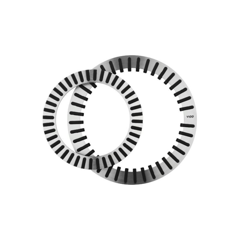 Vipp grydelap-sættet består af en lille og en stor grydelap, som kan sættes sammen. De laserskårne ståloverflader er udstyret med varmeresistent silikonegummi, der beskytter både bord og gryder. Sættet tåler opvaskemaskine og kombinerer funktionalitet med et stilrent udtryk.