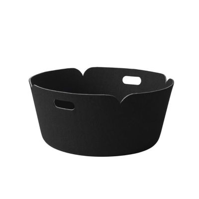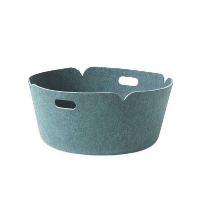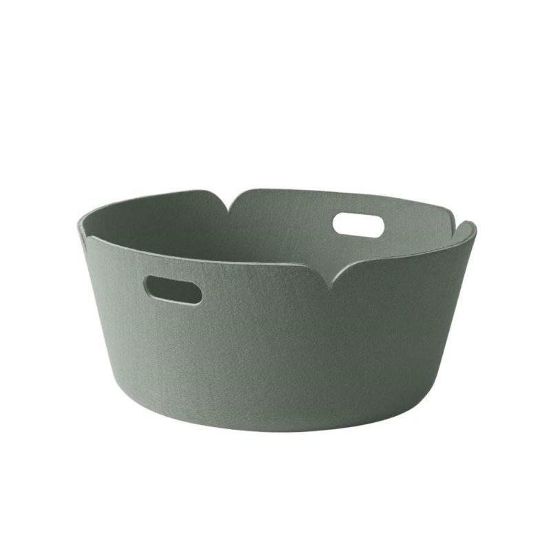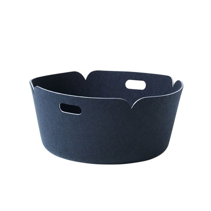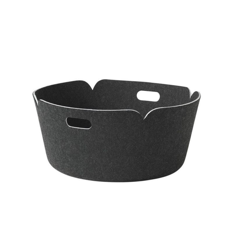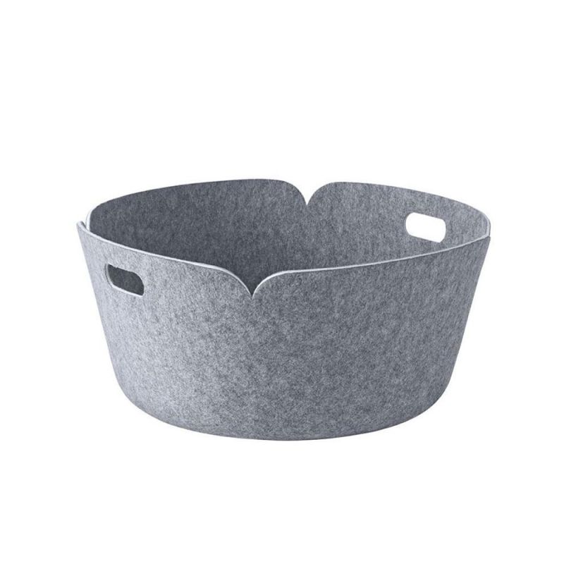 Muuto's opbevaringskurv Restore i den fine runde udgave er designet af Mika Tolvanen i 2009, med henblik på at skabe et bæredygtigt og stilrent produkt som får opbevaringen til at se simpel og ryddeligt ud. Kurven er fremstillet af filt udtrukket af genbrugs plastflasker, som giver et bæredygtig produkt, som med sit bløde og filtet udseende giver en varme og dybde i indretningen.