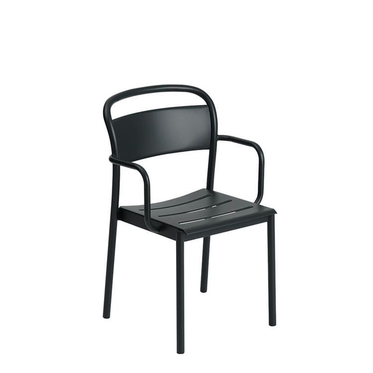 Linear Steel havemøblerne fås som en hel serie med bænke, stole og borde, hvilket gør det nemt at skabe det ønskede ensartede udtryk. Spisebordsstolene Linear Steel fås her med eller uden armlæn.