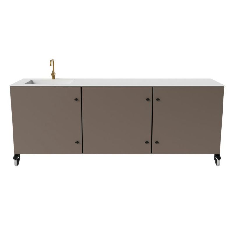 Norrvik utekjøkken fås med ett, to eller tre skap i værbestandige materialer, klare til utebruk hele året. Skapene har tette dører og justerbare hyller (bortsett fra vaskemodulen). Velg mellom seks farger og en robust, hvit Kerrock® bordplate som er varmebestandig, ripebestandig og enkel å rengjøre. Alle modellene har hjul, kan kombineres og krever minimalt med vedlikehold. Designet og produsert i Danmark. Leveringstid: 48 uker.