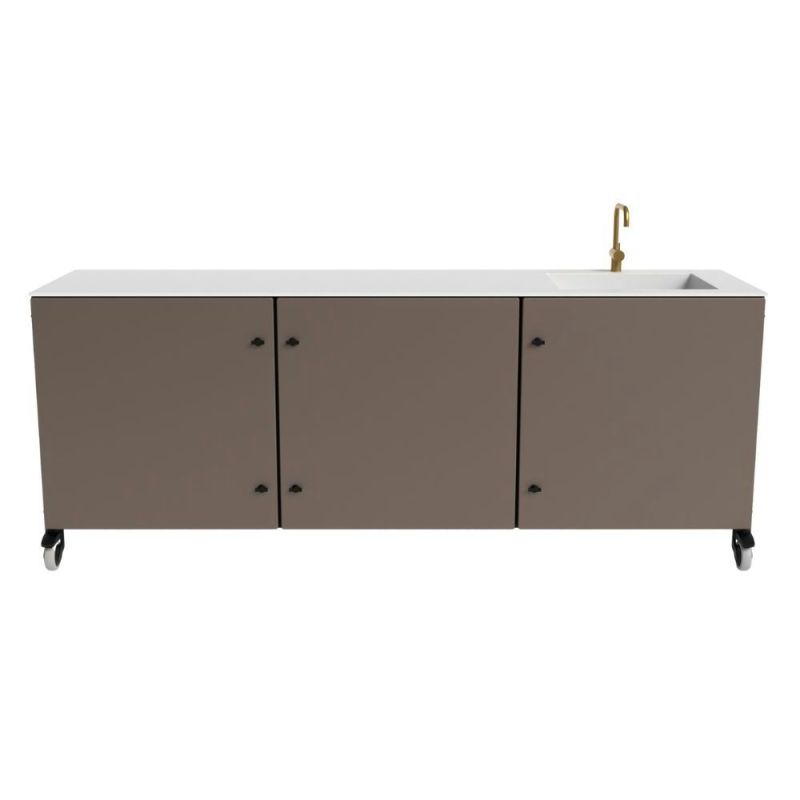 Norrvik utekjøkken fås med ett, to eller tre skap i værbestandige materialer, klare til utebruk hele året. Skapene har tette dører og justerbare hyller (bortsett fra vaskemodulen). Velg mellom seks farger og en robust, hvit Kerrock® bordplate som er varmebestandig, ripebestandig og enkel å rengjøre. Alle modellene har hjul, kan kombineres og krever minimalt med vedlikehold. Designet og produsert i Danmark. Leveringstid: 48 uker.