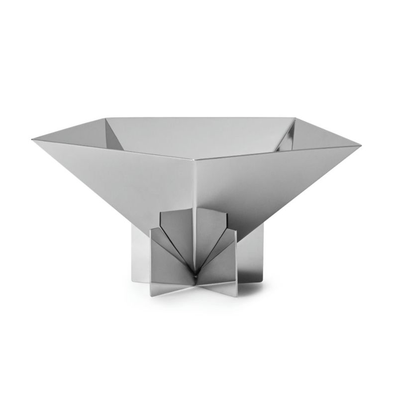 Fem Bowl er håndlaget i speilpolert rustfritt stål, og presenterer et dekorativt, geometrisk design. Oppkalt etter det danske ordet for tallet fem, består skålen av fem trekantede deler som hviler på en femkantet base, håndsveiset av stål. Enten den brukes som dekorasjon eller praktisk skål, tilfører Fem Bowl eleganse til ethvert interiør.