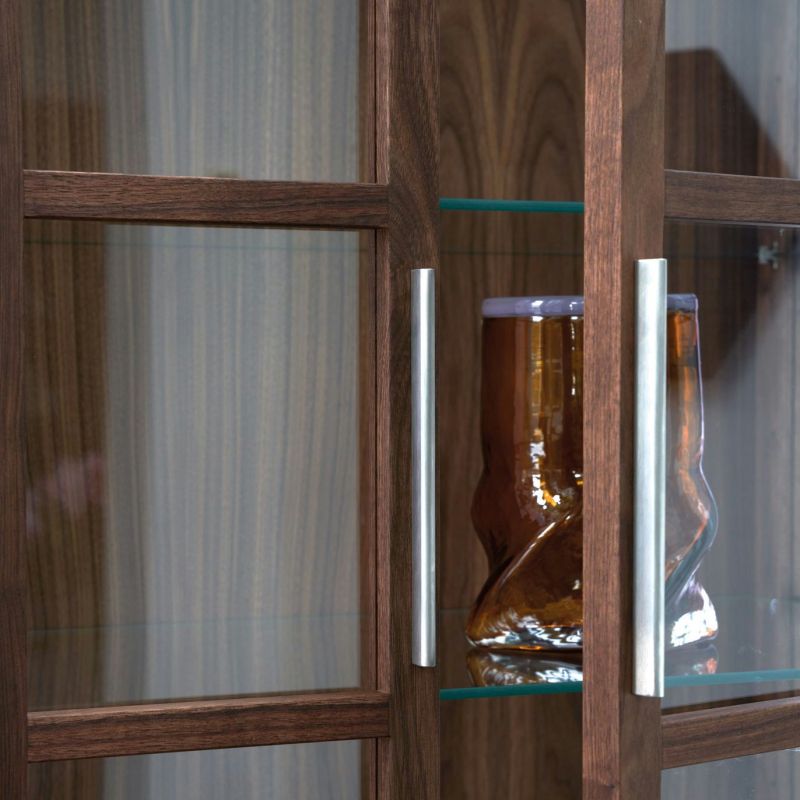 Det fint forarbejdet massive træ med de dekorative ben af børstet stål og det klare glas på siderne og fronten, giver vitrinen et let og elegant udtryk