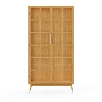 Det fint forarbejdet massive træ med de dekorative ben af børstet stål og det klare glas på siderne og fronten, giver vitrinen et let og elegant udtryk.