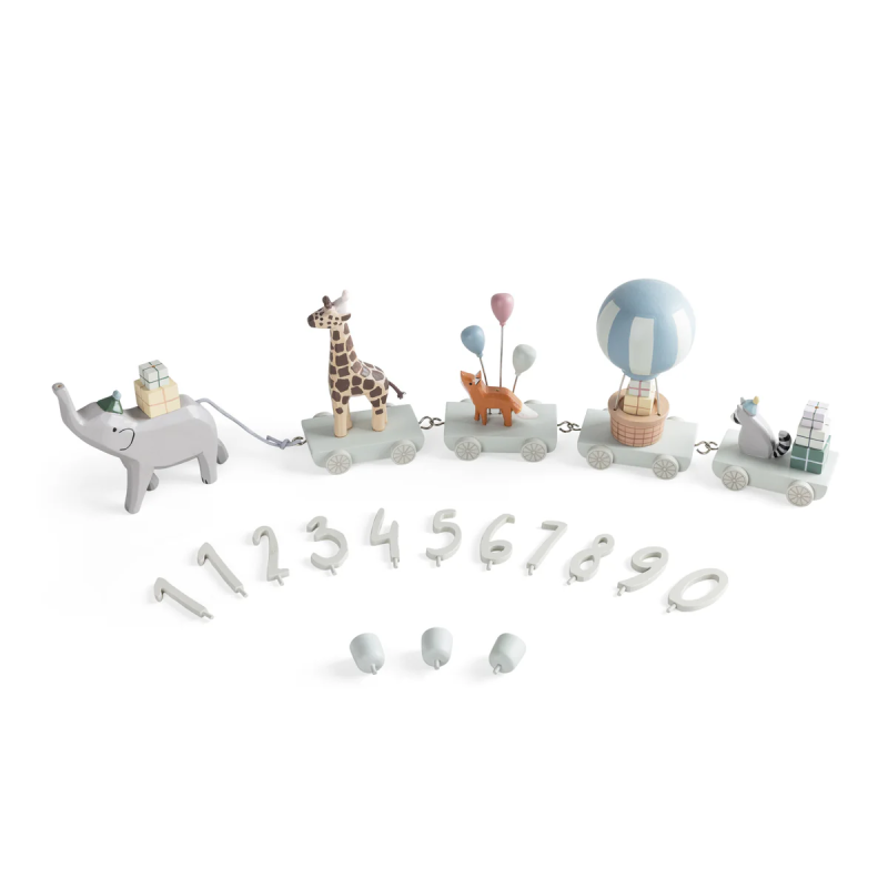 Gør fødselsdagen ekstra festlig med Sebras fantasifulde fødselsdagstog en charmerende parade af dyr trukket af en stolt elefant med snablen i vejret. Toget består af fire vogne med figurer fra World of Sebra, som du selv kan sammensætte. Toget har plads til både medfølgende tal (09) og tre lysholdere, hvor almindelige juletræslys (Ø 1,2 cm) passer perfekt. Brug det til at markere fødselarens alder og skab en tradition, som kan gentages år efter år. Fødselsdagstoget er håndlavet, hvilket giver hvert sæt et unikt udtryk. Det leveres i en flot opbevaringsæske og er en del af Sebras 20-års jubilæumskollektion. En oplagt barsels- eller dåbsgave, som kan bringe glæde i mange år frem.
