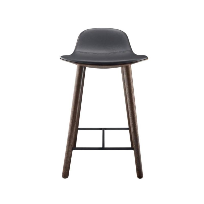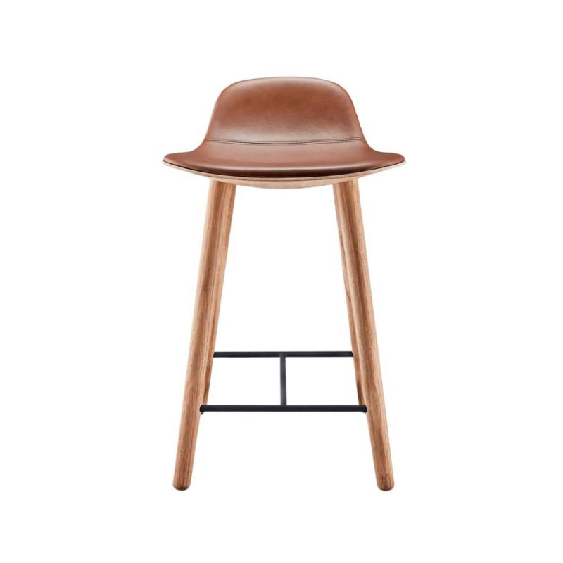Yuuga Counter Stool. Yuuga barstolen er designet med udgangspunkt i, at barstole ofte betragtes bagfra. Derfor kombinerer Yuuga et ydre i formpresset 3D egetræsfiner med en blød inderside i støbt skum og læderpolstring en kontrast, der giver både visuel elegance og høj siddekomfort. Den organiske form og kompakte størrelse gør stolen ideel til at skabe luft og bevægelsesfrihed omkring bordet, samtidig med at man sidder behageligt i længere tid.