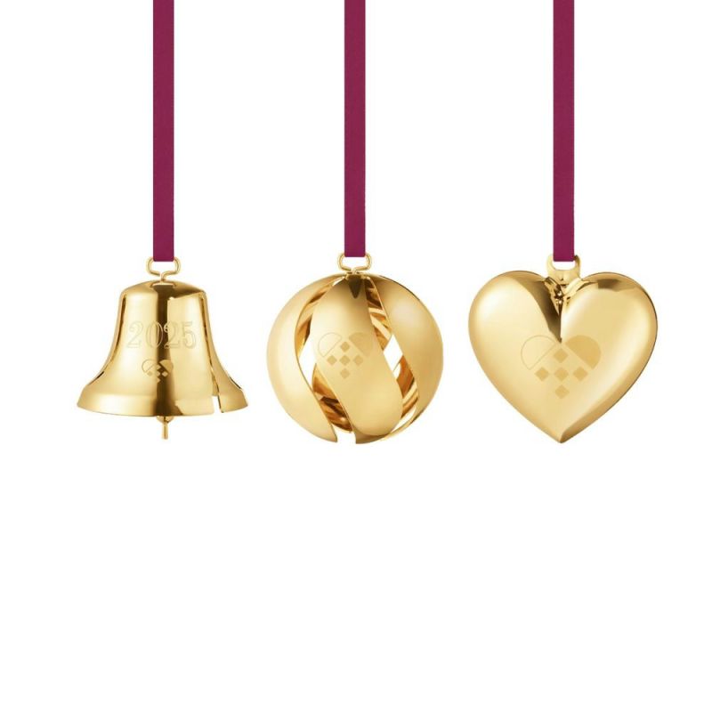 Dette settet med tre gullbelagte ornamenter fra Georg Jensens julekolleksjon 2025 inkluderer en juleklokke, en julekule og et julehjerte, alle med elegante graveringer av det ikoniske flettede julehjertet. Med sine glitrende overflater og fine detaljer bringer ornamentene et snev av klassisk julestemning og nostalgisk sjarm inn i hjemmet ditt. Settet leveres med to bånd: ett i tradisjonell rød og ett i årets kolleksjonsfarge, burgunder, slik at du kan tilpasse utseendet til din egen julepynt.