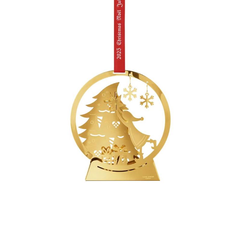 Årets julemobil fra Georg Jensens julekolleksjon 2025 forestiller en snøkule med en jente som plasserer stjernen på et glitrende juletre, et motiv fullt av varme og julestemning. Mobilen er laget av messing og belagt med 18 karat gull, og er en del av den tradisjonelle serien med samleobjekter, som presenterer et nytt og stemningsfullt design hvert år. To bånd er inkludert: et klassisk rødt julebånd og ett i årets kolleksjonsfarge, burgunder.