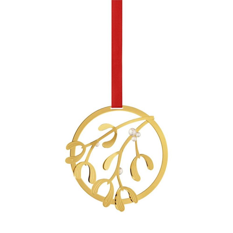 Denne elegante juleuroen blir en del av Georg Jensens faste julekolleksjon. Den er fremstilt i messing, belagt med 18 karat gull, og motivet er en misteltein-gren i en rund ramme. Det medfølger et rødt bånd, så juleuroen kan henges opp på treet eller skape en koselig julestemning andre steder i hjemmet.