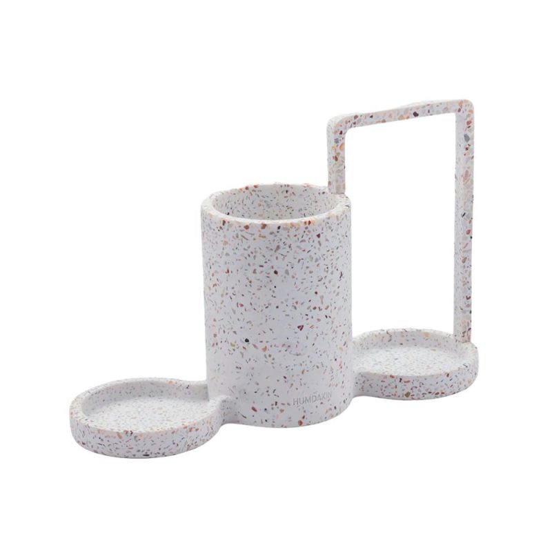 Et alt-i-ett oppvasksett i terrazzo som gir plass til alt du trenger ved kjøkkenvasken. Den praktiske oppbevaringsdelen er ripefri og lett å rengjøre - perfekt for å holde orden på oppvaskbørste, såpe og klut.