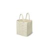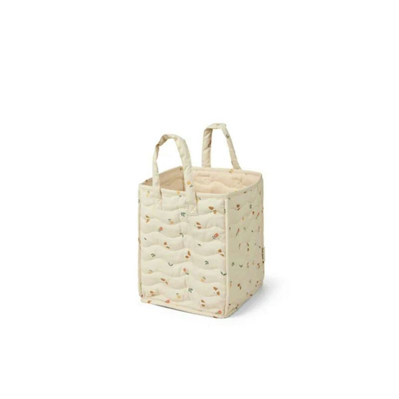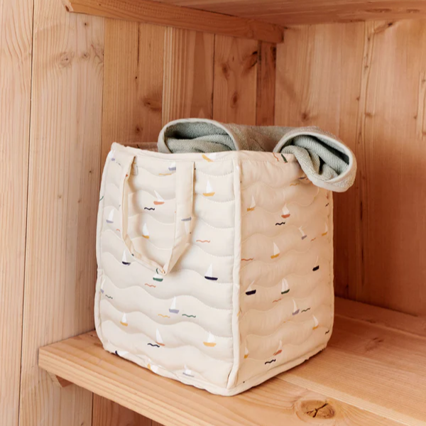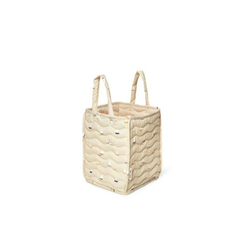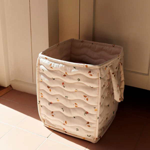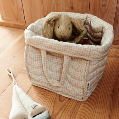Myk og stilfull oppbevaringskurv med dekorativ bølgete quilting og store håndtak, perfekt for små hender som enkelt kan bære kurven.