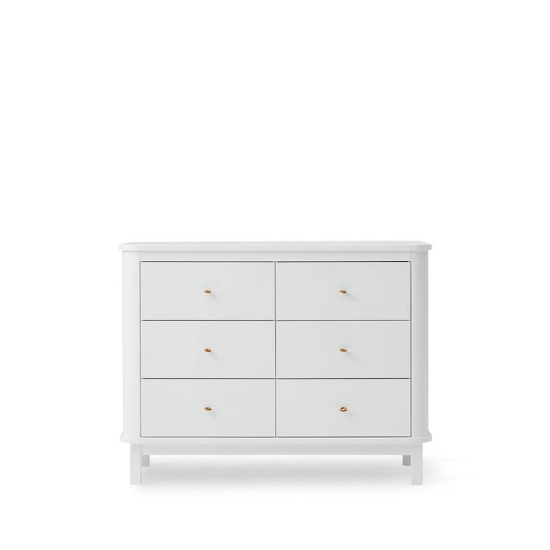 • Materiale: Wood kommoder med 6 skuffer er fremstillet i MDF, der er konstrueret træ, der består af 60% birk, 20% fyrretræ og 20% asp træ. MDF er meget stærkt og holdbart. Kommoderne tilbydes i to forskellige modeller: en med ben og knager i smuk, hvid-olieret eg og en i helt hvid med ben og knager i birk. De ikke-synlige skruer giver kommoden et rent og eksklusivt design og er særligt kendetegnende for Oliver Furniture. Stilen er skandinavisk med rene linjer, runde former og enkle detaljer som greb af kernelæder og integrerede knager. Kommoden er produceret i Europa og overholder de strenge EU-krav for sikkerhed og sundhed. Kommoden er malet med ikke-giftig, REACH-certificeret maling.