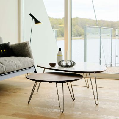 Sofabordene AK 18101881 har et elegant, minimalistisk design med rene linjer. Serien består av fem modeller med massivtre- eller Corian-bordplater i forskjellige former, størrelser og tresorter, slik at du kan sette sammen bordene etter eget ønske og behov.