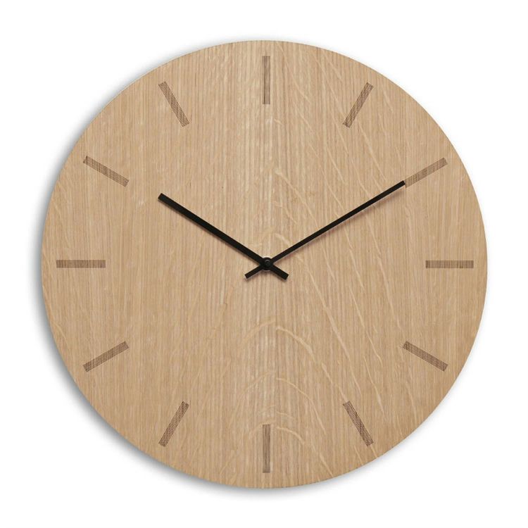 Veggklokkene fra Danske Hemverk er stilige og veldesignede, med fokus på nordisk enkelhet og eleganse. Klokkene finnes i mange forskjellige og flotte varianter, men her kan klokken sees i lys eik. Klokken er laserskåret fra lys eik og er tilgjengelig med visere i sort, gull, kobber eller sølv, som gir hvert sitt uttrykk.